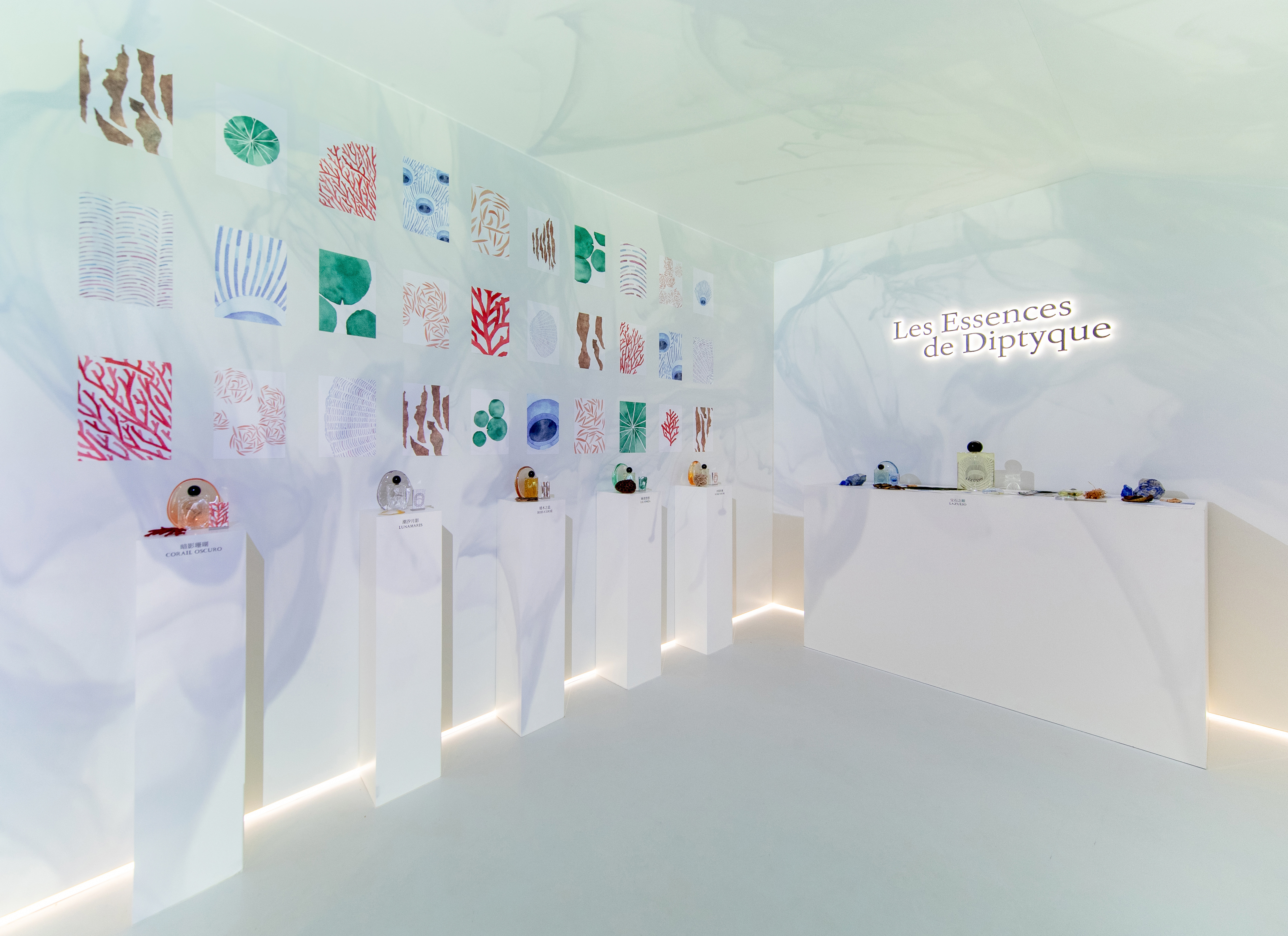 这方璀璨的空间展示了Diptyque最具代表性的高端香氛系列之一,该系列诞生于一种独特的理念。“大千之蕴”淡香精系列意图捕捉的,是香气之外的本真:那些自然界原本无香却依然动人的奇珍异宝——珊瑚、珍珠母、树皮、睡莲、沙漠玫瑰。Diptyque对这些无香之物心生迷恋,特邀调香艺术大师历时两年以香气为它们重新赋形:“暗影珊瑚”,灵感源自威尼斯泻湖深处的珊瑚;“潮汐月影”,摹写珍珠母的莹润;“暖木之息”,交融树皮的粗砺与咖啡的醇厚;“睡莲悠悠”,还原睡莲的静谧之姿;“沙漠玫瑰”,以辛香与柑橘重新定义荒漠中的绽放。展厅现场,柔和的投影如水彩般缓缓晕染,引领观者沉入自然诗意的梦境。桌上的试香纸,邀请每位访客开启一场私密的感官仪式:收集、拼贴、组合出属于自己的“嗅觉手记”——半是记忆,半是想象。
