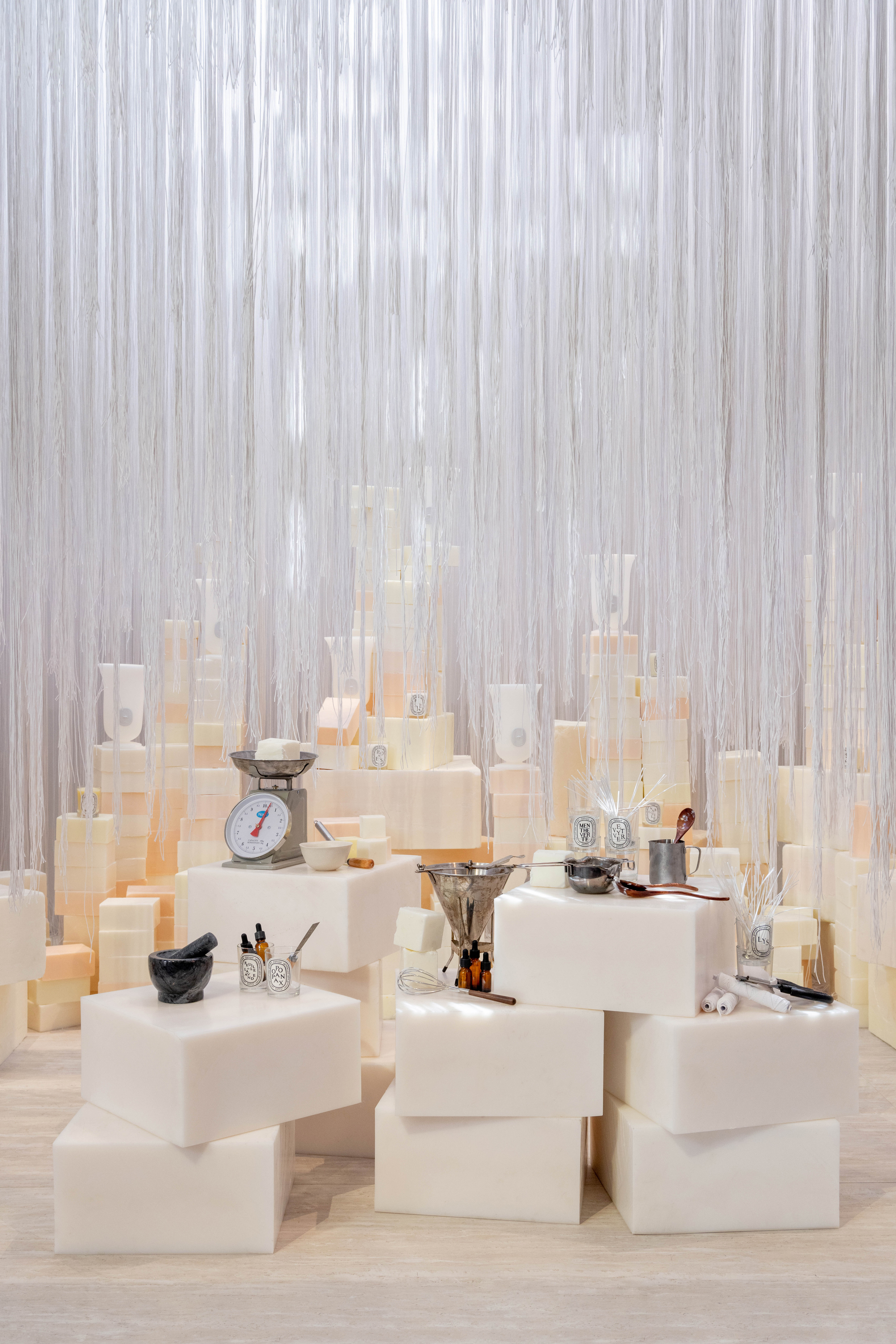 Diptyque的每一件作品,都在诉说形态与材质相遇的故事。在这间工坊,访客踏入一个充满手工韵律的匠心世界——每一款器物在指间历经塑形、打磨、浇注与成型。蜡、玻璃与陶瓷,材质间的诗意低语交织出实用与美学的和谐共鸣。一侧,硼硅酸盐玻璃精妙地捕捉着舞动的光影,成为Diptyque烛罩的专属载体。另一侧,历经九道工序的珐琅釉陶瓷,凝聚着Diptyque大号陶瓷烛杯背后精湛而耐心的匠艺。蜡,作为品牌的本源材质,在此呈现多重形态——凝固、熔融、藏香,它既是物质载体,亦是美学宣言。一座声音装置轻轻揭晓多重工艺的韵律:吹制玻璃的呼吸声、釉彩轻刷的细响、冷却蜡体的切割音。四周摆放的制蜡工具如同参与合奏的乐器,每一件都留存着匠人使用的痕迹。这处空间并非仅为技艺展示,更是一场以双手为媒介的传承仪式。它传递着品牌从未更改的信念:对手工的虔诚,对匠艺传统的坚守,以及对精准技法终将唤起情感共鸣的笃信。